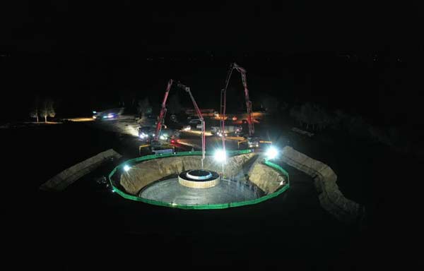 10月8日凌晨3点,沽源草原寒意袭人,项目施工现场却一片热火朝天。全体参建人员放弃节假日休息坚守一线,十余盏大功率照明灯将作业面照得如同白昼,5 台混凝土搅拌车有序卸料,2 台泵车舒展长臂精准输送混凝土。身着反光背心的施工人员分工明确:振捣手紧盯料流高频作业,确保混凝土密实度;质检员手持测温仪实时记录数据,把控浇筑温度;安全员沿作业区不间断巡查,筑牢安全防线。历经 11 小时连续奋战,团队以 “零差错” 完成浇筑任务。“风机基础是整台设备的‘定海神针’,必须一次性浇筑成型,半点马虎不得。” 连续坚守 6 小时的工人王师傅的话,道出了全体建设者的责任与担当。