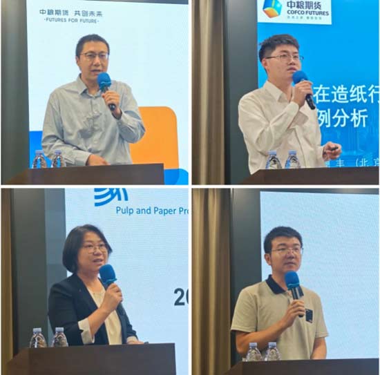 中粮期货产品研发中心(研究院)资深宏观分析师范永嘉、纸浆纸张产品理事会PPPC(Beijing)孟莉、中哲农产品公司纸浆研究员裴凯伦、中粮祈德丰(北京)商贸有限公司衍生品部副总监马时雨分别做了《宏观经济解析及展望》《2025年双胶纸市场运行情况》《期权在造纸行业中的运用及案例分析》《纸浆市场交易逻辑辨析》的主题内容分享。