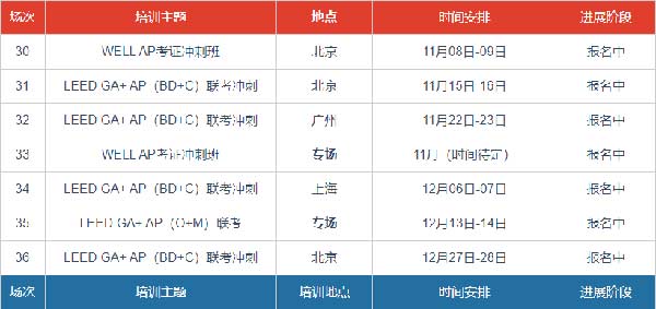 注:LEED 精讲班(含GA+AP)或WELL AP精讲班,为一次性考试通过类培训。