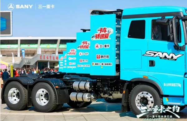 赛场外,10台三一重卡组成“钢铁方阵”霸气进驻娄底体育中心,江山平顶425、高顶425、SE588三款硬核车型列队迎宾,气场全开为赛事护航,成了耀眼的“天海蓝风景线”。