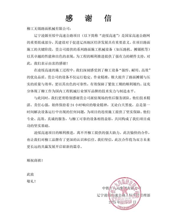 项目方在感谢信中特别提到,柳工路机设备性能卓越,操作便捷,在提升施工效率、保证工程质量方面发挥了重要作用。同时,柳工服务团队响应迅速,提供了全程贴心的技术指导与运维保障,有效解决了施工过程中的难点问题,展现了高度的责任感与专业水准。