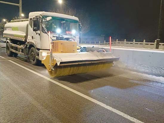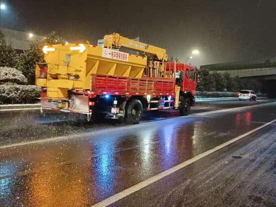 上图 “东方红”融冰撒布车在洛阳环城路撒盐融冰