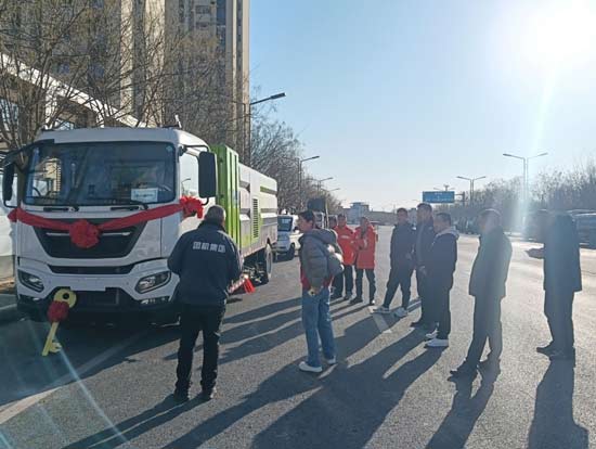 雪后放晴,新车及时交付用户。下图为大型18吨纯电动洗扫车披红挂彩驶入环卫一线,投入2026年新战斗。